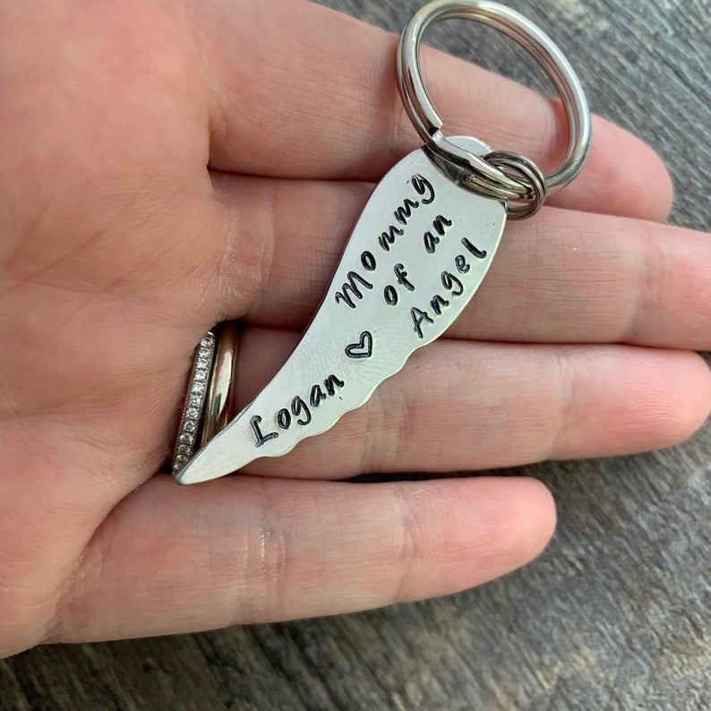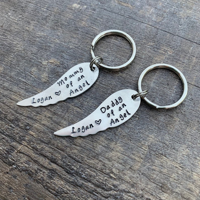 - Set includes 2 keychains. One will say “Mommy of an Angel” and the other will say “Daddy of and Angel”